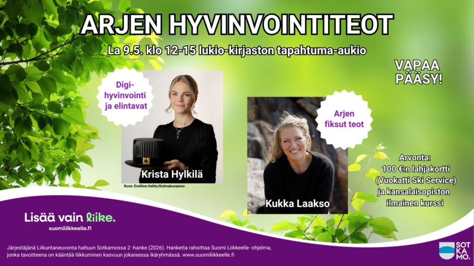Sotkamon kunnan liikuntaneuvonta järjestää toukokuun 9. päivä lukio-kirjaston tapahtuma-aukiolla klo 12–15 Arjen Hyvinvointiteot -luentotilaisuuden kaikille omasta hyvinvoinnistaan kiinnostuneille.