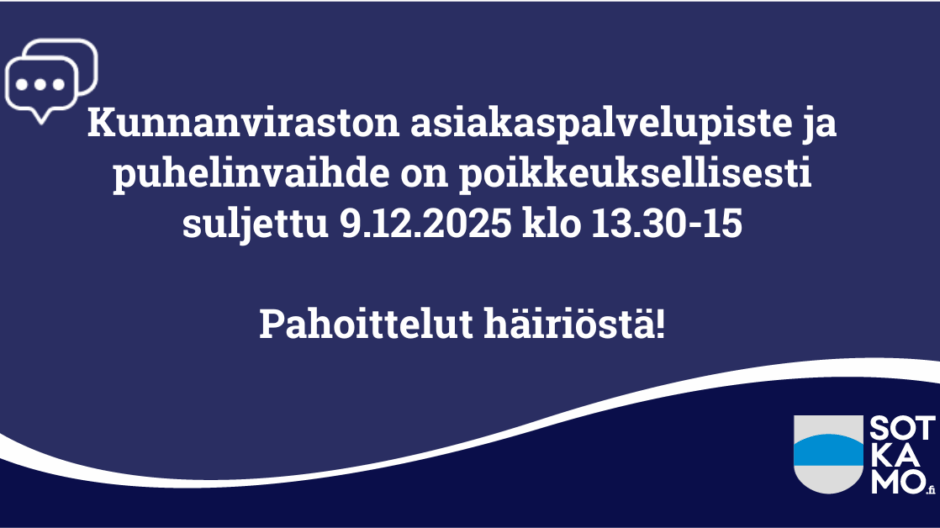 Asiakaspalvelupiste ja puhelinvaihde poikkeuksellisesti suljettu 9.12.2025 klo 13.30-15.00