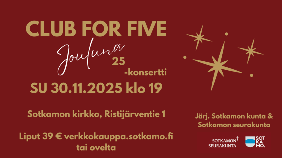Sunnuntaina 30.11.2025 kello 19 koetaan Sotkamon kirkossa (Ristijärventie 1, 88600 Sotkamo) Club for Fiven rakastettu Jouluna-konsertti, jonka siivittämänä koetaan aito joulumieli! Edellisen kerran Club for Five esiintyi Sotkamossa unohtumattomassa Suomen luonnon päivän konsertissa Hiidenportin kansallispuistossa.