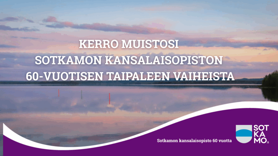 Sotkamon kansalaisopisto juhlii 60-vuotista taivaltaan lukuvuoden 2026–2027 aikana. Toivoisimme nyt muisteluja Sotkamon kansalaisopiston vaiheista: mitä mukavaa kursseilla on tehty, millaisia kommelluksia on sattunut? Mitä asioita olet päässyt kursseilla oppimaan, ja mitä kaikkea muuta mieleenpainuvaa kurssit ovat antaneet? Muistoja saa lähettää kaikkien toimipisteiden (Sotkamo, Kuhmo, Paltamo, Ristijärvi) alueelta.