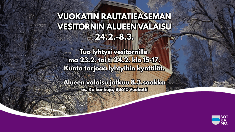 Kunta kutsuu sinua tuomaan lyhtysi Vuokatin rautatieaseman vesitornille maanantaina 23.2. tai tiistaina 24.2. kello 15-17.