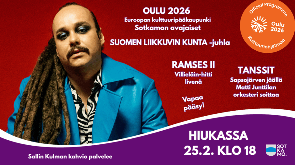 Oulu2026-kulttuuripääkaupunkivuoden Sotkamon avajaisia juhlitaan keskiviikkona 25.2.2026 klo 18 Hiukassa, Sotkamojärven jäällä. Avajaisissa juhlistetaan samalla Sotkamon valintaa Suomen liikkuvimmaksi kunnaksi.