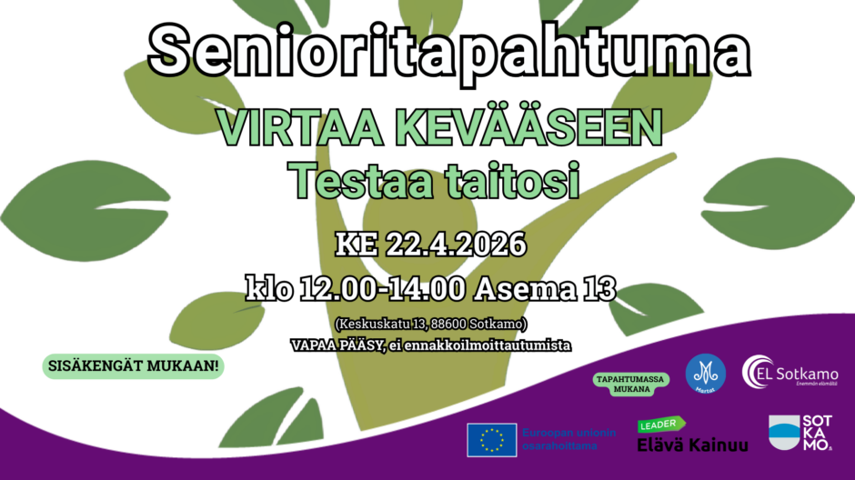 Senioritapahtuma Virtaa kevääseen järjestetään keskiviikkona 22.4. klo 12.00–14.00 Asema 13:sta. Tämänkertaisen tapahtuman teemana on testaa taitosi.