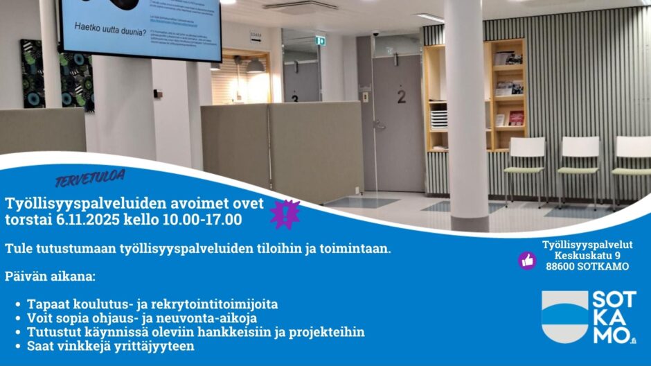 Työvoimakumppanipäivää vietetään Sotkamon työllisyyspalveluissa 17.9.2025 klo 9.00-14.00. Paikkana on työllisyyspalveluide…