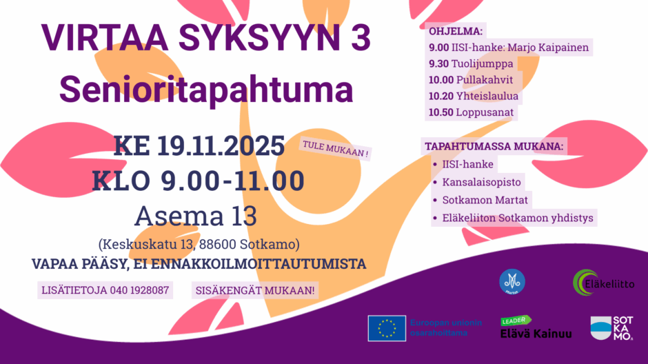 Virtaa syksyyn 3 -senioritapahtuma järjestetään keskiviikkona 19.11. klo 9-11 Asema 13:n tiloissa