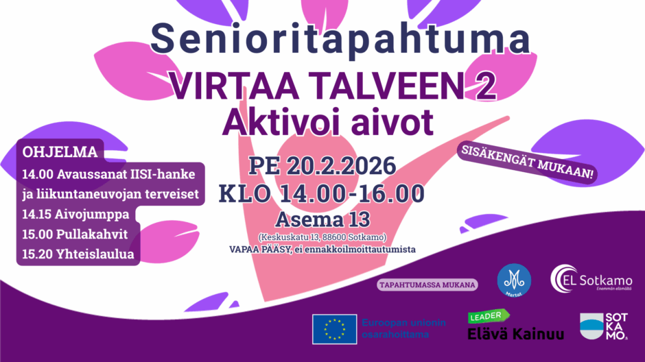 Virtaa talveen 2-senioritapahtumaa vietetään helmikuussa perjantaina 20.2. klo 14.00–16.00 Asema 13 tiloissa (Keskuskatu 13, 88600 Sotkamo).