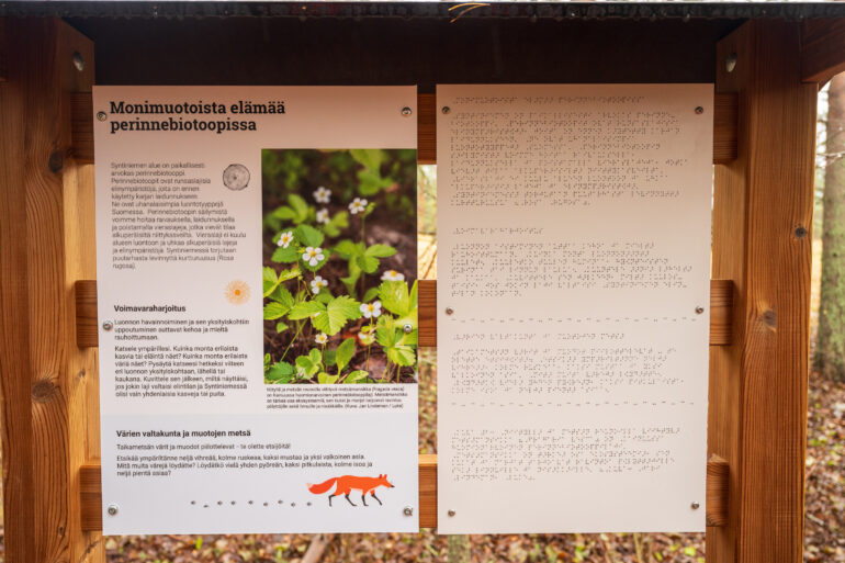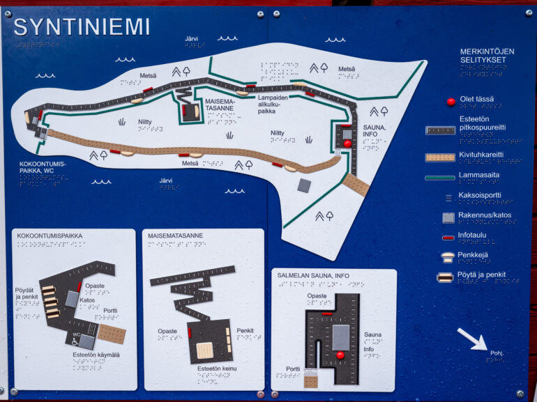 Syntiniemen esteetön lähiluontoreitti yhdistää luonnon ja hyvinvoinnin. Reitti tarjoaa luontoelämyksen kaikenikäisille ja kaiken kuntoisille kulkijoille. Vuonna 2025 valmistunut 510 metrin rengasreitti yhdistää 300 metriä puurakenteista metsäreittiä ja 210 metriä kivituhkapintaista niittyosuutta. Reitti on esteetön, ja näkörajoitteiset on huomioitu kohokartoilla, pistekirjoituksella ja kohomerkinnöillä. Alueella voi rauhoittua metsäkirkossa, nauttia maisemista näkötasanteelta ja tutustua luonnon terveysvaikutuksiin ja alueen historiaan. Kesäisin Syntiniemen maisemanhoito toteutetaan perinteisin menetelmin – lampaat pitävät niityn elinvoimaisena ja ilahduttavat kävijöitä.