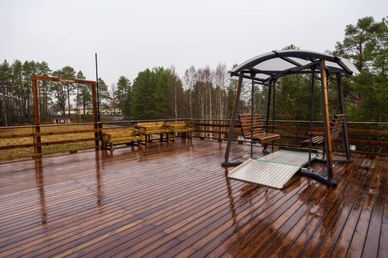 Metsäreitin varrella on esteetön maisematasanne, jossa voi levähtää ja nauttia näkymistä. Tasanteella on esteetön keinu sekä kolmitasopenkkejä korkeuksilla 300, 450 ja 550 millimetriä. Penkkien päädyissä on käsituet, jotka helpottavat istumista ja nousemista.